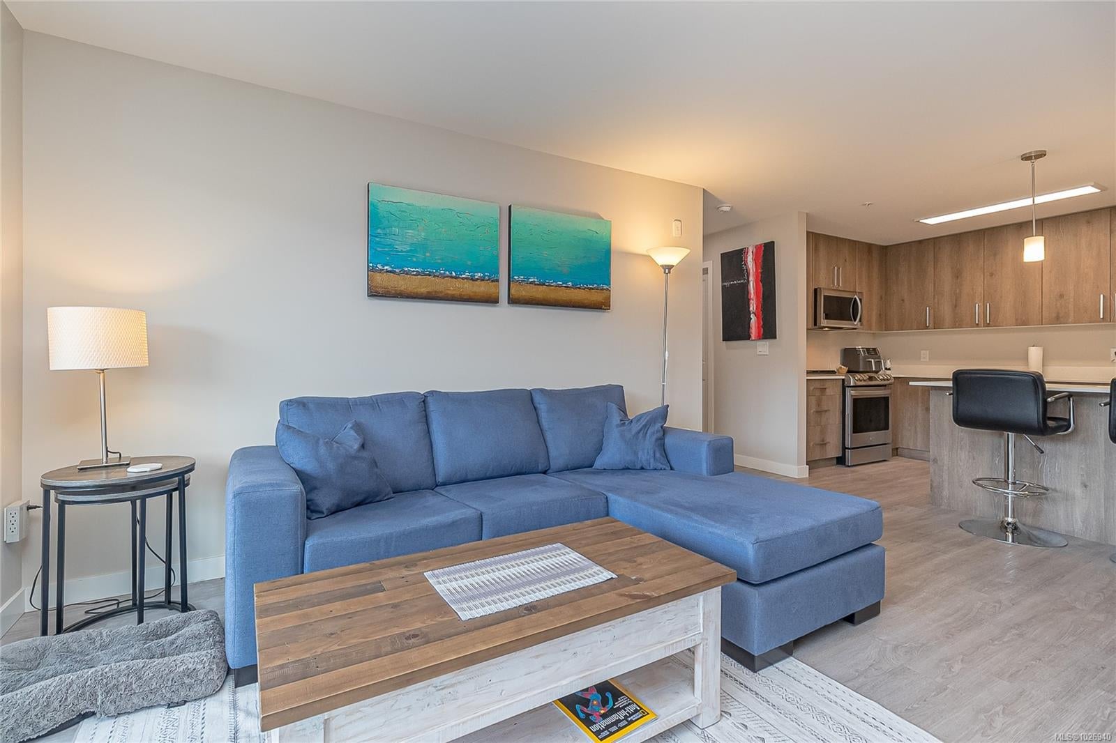 OH SAT FEB 28th 1-3 pm. Discover Thetis Lakeside! Highly desirable development (2019) perfectly positioned just steps from expansive green space. This bright 2 bed/2 bath unit features a spacious & split-bedroom layout & a new (Feb 2026) spa-inspired ceramic tile walk-in shower in the primary ensuite. The open-concept main living area includes a kitchen w/ a stone countertop central island, stainless steel appliances & plenty of cabinets & prep space. Oversized windows fill the living area w/ natural light & a sun-soaked west-facing balcony offers views of Mill Hill & beyond. The interior showcases light-toned finishes & vinyl plank flooring creating a warm & contemporary space. Custom Murphy Wall bed in 2nd bedroom. Generously sized storage on the same floor, secured underground parking & within proximity to the Galloping Goose & E&N bike paths, The Nest Café & Six Mile Pub. Building amenities include bike/kayak storage & a fenced dog park. Pet-friendly with no size restrictions!